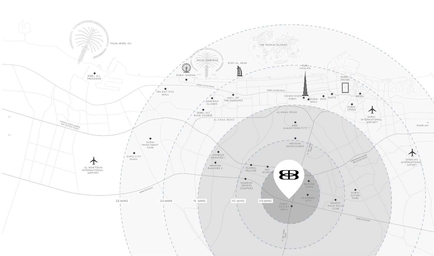 Landmarks & Residential Hubs: Burj Khalifa - 20 mins, Dubai Frame - 20 mins, Jumeirah Beach Residences (JBR) - 25 mins, Palm Jumeirah - 25 mins, Dubai Marina - 25 mins, Dubai Creek - 20 mins
